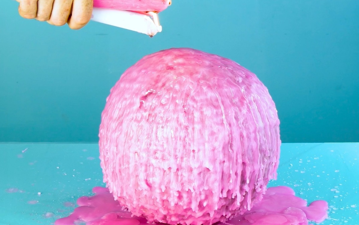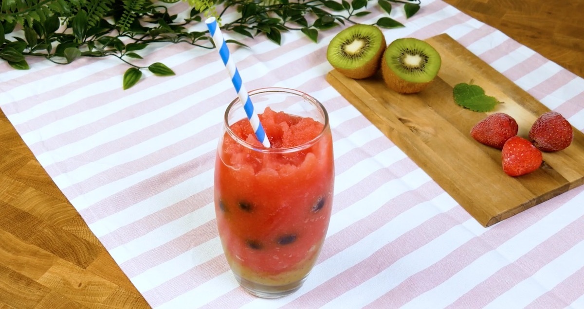 그다음 이 과일 얼음을 다시 갈아서 잔에 담으세요! 블루베리로 씨앗을 연출하면 영락없는 수박 스무디가 완성됩니다.