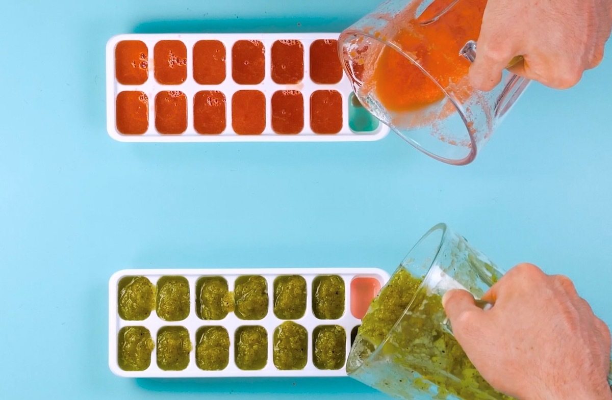수박 퓌레를 얼음틀에 채우고 냉동실에 넣어 얼립니다. 잘 어울리는 음료 안에 수박 얼음을 넣으면 시원한 과즙 주스가 되죠.